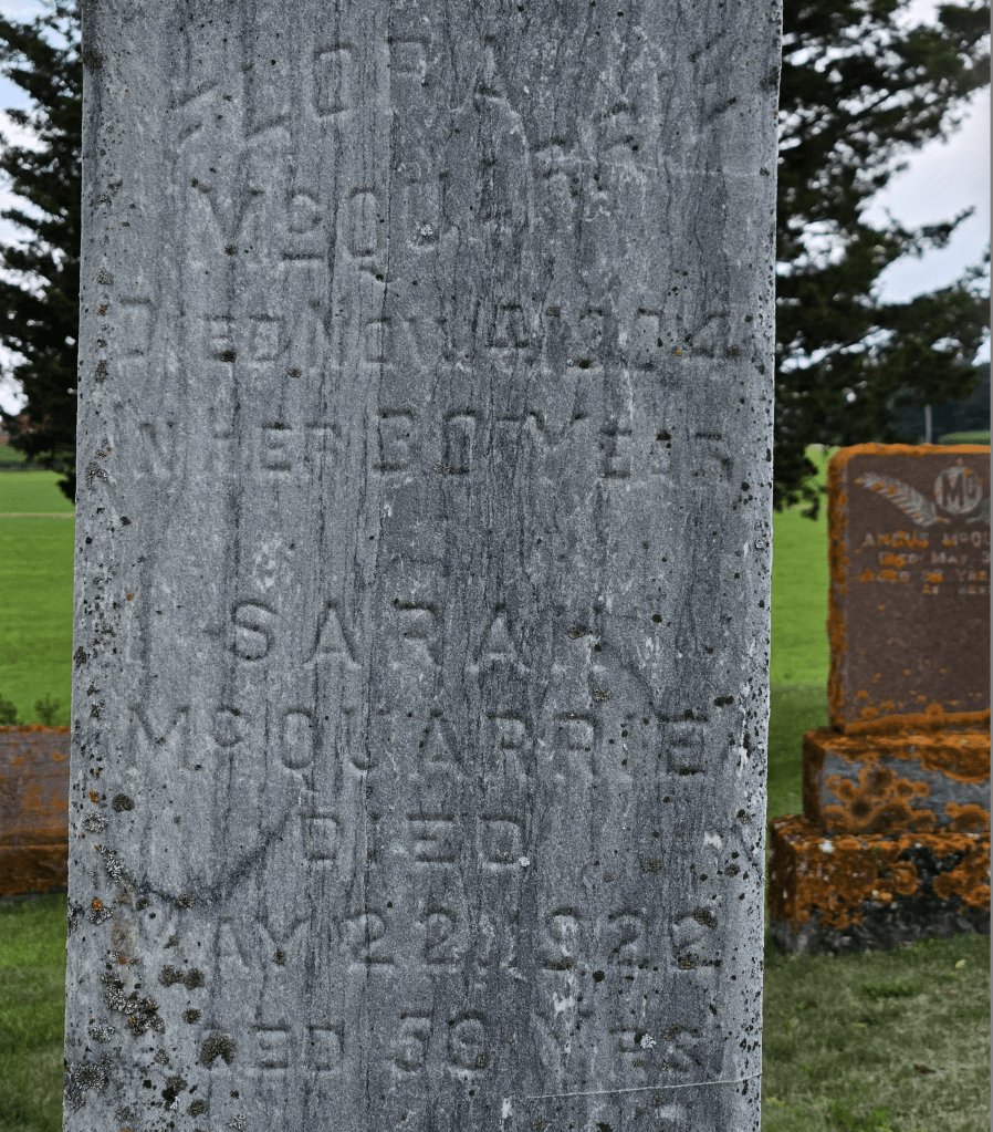 11Some others were Flora (27), Angus (25), Catharine (23), Lauchlan (21), and Ellen (19). Flora’s name is above Sarah’s on the pillar over the graves.
