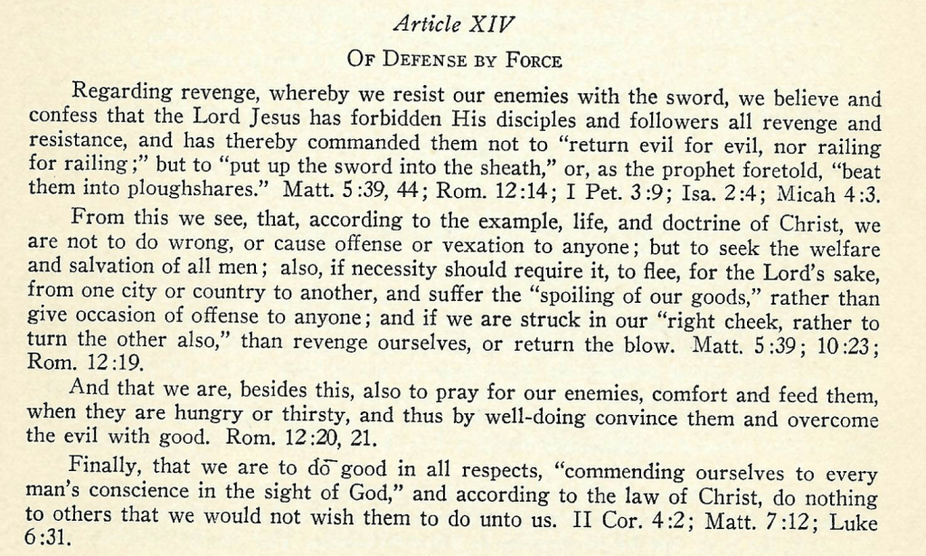 Articles of Faith. When the newly-formed Reforming Mennonite Society merged with the older New Mennonite Church of Ontario in March 1875 at Snyder’s Mennonite Church, Bloomingdale, ON, to become the “United Mennonite Church,” they accepted as a doctrinal basis the Dordrecht Confession of 1632. This confession had become a standard teaching tool for baptismal candidates among North American Mennonites.13 Article XIV, “Of Defense by Force” dealt with revenge, resisting enemies, and enjoined the opposites, doing good and praying for enemies.14 Subsequent mergers of the United Mennonites in 1879 and 1883 did not mention the Dordrecht Confession, but included in the Articles of Faith of the MBiC was one on “Nonresistance,” later called “Self-Defense,” and even later “War, Peace and Self Defense.” The early article quoted Jesus’ words in Matthew 5:39, John 18:36 (“My kingdom is not of this world. If it were, my servants would fight…”), Romans 12:17 (“Do not repay anyone evil for evil…”), and Hebrews 10:34 (“…and [you] joyfully accepted the confiscation of your property…,” a frequent result of non-resistant life.)15 Later editions of the Discipline quoted even more passages of Scripture.