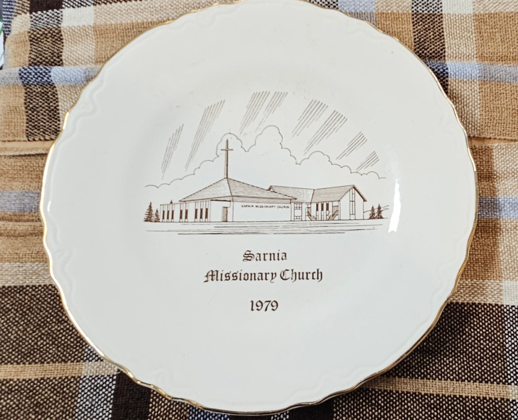I do not know what was happening in the Missionary Church in the USA, maybe our brethren and sisters there can respond to this post. A factor for us in Ontario may be that the company we mostly bought from was based in the town of Collingwood, ON, where we had a congregation, and still do.4 I used to think the plates were manufactured in Collingwood and churches then had their custom design added in gilt. Photographing the plates in the MCHT had me look more closely, and I learned the plates were actually produced in China, only the design was added in Collingwood.